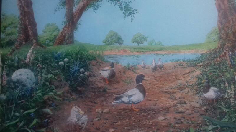 This painting was created as a present for my partner for her birthday. I paint the children as characters of ourselves ( the bob- cap on the boy was crocheted by my partner Sue). Each year we go to a lake for the pleasure of tadpole catching, from which many a large and tiny frog populates the pond and garden.